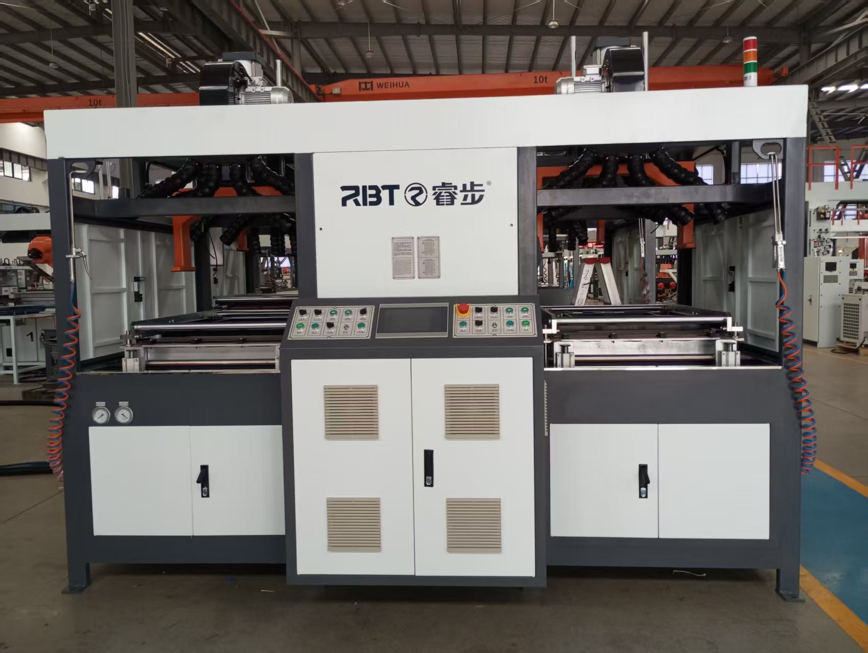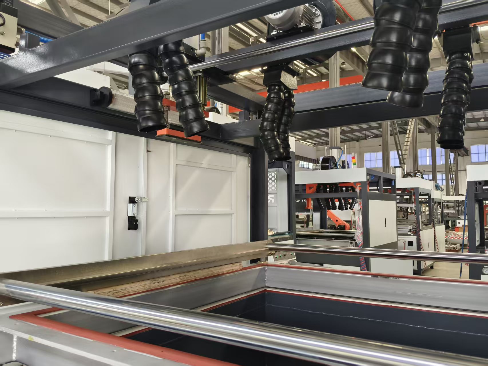 To ensure the stability of polycarbonate materials during the heating process, the equipment is equipped with a laser distance meter to prevent the plates from falling off due to overheating. In addition, the design of the vacuum box guarantees sufficient vacuum capacity. Both the left and right forming stations are equipped with blowing, a small vacuum for the first time, a large vacuum for the second time, and demolding blowing devices, and the flow rate is precisely controlled by the gate valve switch.